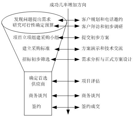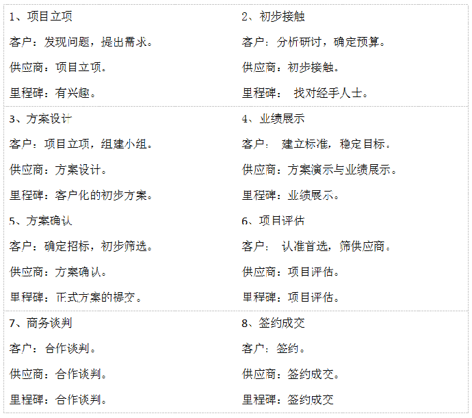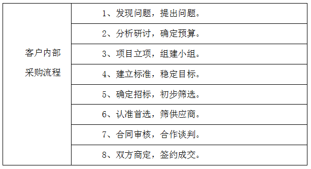 | 企業(yè)業(yè)務(wù)管控需要一套完善的管理系統(tǒng),我們這里特別設(shè)定企業(yè)業(yè)務(wù)管控系統(tǒng)。它不僅僅是一種管理理念,同時也是一個管理體系、一個操作性很強(qiáng)的管理系統(tǒng)。 業(yè)務(wù)管控系統(tǒng)非常提倡過程管理,而且控制過程比控制結(jié)果更重要。在銷售中,一個銷售項目受到太多來自內(nèi)部和外部因素的影響,其結(jié)果的成敗與否是難以預(yù)測和控制的。 一、業(yè)務(wù)管控系統(tǒng)的特點 主要是讓原來只掌握在銷售人員手中的有關(guān)銷售過程的信息向銷售團(tuán)隊、銷售經(jīng)理和企業(yè)公開,使得: l 銷售人員的信息更加公開化,便于掌控客戶的進(jìn)展; l 讓項目的銷售過程更加明確化,標(biāo)準(zhǔn)化,系統(tǒng)化; l 便于項目內(nèi)部的角色分工,使團(tuán)隊合作進(jìn)一步加強(qiáng); l 更好地做好銷售管理與銷售預(yù)測的工作; l 企業(yè)積累應(yīng)有的銷售知識和客戶資源。 二、企業(yè)業(yè)務(wù)管控系統(tǒng)的模型圖 如圖6-1所示。 ![]() 圖6-1 企業(yè)業(yè)務(wù)管控系統(tǒng)的模型圖 基礎(chǔ)組成要素:了解客戶內(nèi)部采購流程 客戶內(nèi)部采購流程是從客戶的角度對整個采購過程一般必須經(jīng)過的步驟進(jìn)行劃分和描述。它通過跟蹤和記錄客戶采購目前的狀態(tài)以及客戶、競爭對手的回應(yīng),依據(jù)對內(nèi)部采購流程的劃分,分析并確定目前客戶采購所處的階段。讓我們更清晰的去了解,如何去對這八大流程階段進(jìn)行分析,該從哪幾個方面進(jìn)行著手。客戶內(nèi)部采購流程包含八個階段如表6-1所示。 表6-1 八個階段表 ![]() 1、 發(fā)現(xiàn)問題,提出問題; 一般公司都是有現(xiàn)成的供應(yīng)商,我們的機(jī)會點就在尋找目前客戶與現(xiàn)有供應(yīng)商合作中的不滿意或者問題,往往問題越大,我們的機(jī)會點就比較有優(yōu)勢。所以,在采購方的需求醞釀的階段,銷售方在這個階段介入明顯是最好的時機(jī),畢竟“先入為主”,銷售方可以在這個階段影響到采購方的后來的“采購標(biāo)準(zhǔn)”。 2、分析研討,確定預(yù)算; 了解目前項目的預(yù)算,確立項目立項的可能性,萬一項目的預(yù)算少了,一般都要通過老板來進(jìn)一步申請,這時,往往與老板見面的可能性較大,有時項目的經(jīng)辦人無法說服他自己的老板,有可能請你協(xié)同說服。 3、項目立項,建立小組; 緊接著,在客戶項目立項階段,銷售顧問應(yīng)當(dāng)提供準(zhǔn)確信息,培養(yǎng)內(nèi)部的spy立項,準(zhǔn)備應(yīng)標(biāo)。因此需要對內(nèi)部采購流程相當(dāng)了解,如此才能建立項目采購的優(yōu)勢。 4、建立標(biāo)準(zhǔn),穩(wěn)定目標(biāo); 當(dāng)客戶的采購部門開始收集信息和標(biāo)書時,銷售顧問應(yīng)當(dāng)在內(nèi)部確認(rèn)招標(biāo)范圍,主動了解技術(shù)表述的內(nèi)容,參與制定采購標(biāo)準(zhǔn),目的是為了建立客戶關(guān)系,同時了解競爭對手以及客戶內(nèi)部的關(guān)系。 5、確定招標(biāo),初步篩選; 經(jīng)辦人通常是客戶內(nèi)部的采購經(jīng)理類的角色,他需要發(fā)布信息,收集信息,同時,初步篩選合格的供應(yīng)商,一般是從十家供應(yīng)商剩下三家等,為確定首選供應(yīng)商做鋪墊。 6、認(rèn)準(zhǔn)首選,篩供應(yīng)商; 通過技術(shù)標(biāo)與商務(wù)標(biāo)的因素而確立篩選的標(biāo)準(zhǔn),例如:價格、質(zhì)量、品質(zhì)、品牌、行業(yè)標(biāo)準(zhǔn)、職業(yè)化、關(guān)系等因素來選擇首選的供應(yīng)商。 7、合同審核,合作談判; 最為采購方來說,確定供應(yīng)商后,要在談判中盡量壓低成本,并為企業(yè)爭取有利的付款方式降低風(fēng)險。該項目后續(xù)實施如何很大程度上取決于合同條款上的具體規(guī)定,所以該過程是非常關(guān)鍵的,客戶可能專門組織談判小組,與首選供應(yīng)商來談具體的條款。 8、雙方商定,簽約成交。 商務(wù)具體條款雙方商定后,雙方法人簽署合同。開始進(jìn)入具體的合作及售后服務(wù)階段,在該階段之前,可以說銷售方是很成功的,否則,對方也不會選擇和你合作。有人錯認(rèn)為銷售活動到此結(jié)束了,其實還沒有,這只是個開始,如何將該客戶綁定為企業(yè)的忠實客戶,這就需要銷售方在實施及售后客戶關(guān)系維系方面下工夫了。 該管控系統(tǒng)的起點是客戶內(nèi)部采購流程。產(chǎn)品、服務(wù)的供應(yīng)方了解客戶內(nèi)部采購流程的目的是為了提高銷售的成功率。每個客戶都有自己的一套內(nèi)部采購流程。供應(yīng)方想要實現(xiàn)銷售,必須按照客戶的規(guī)則行事,根據(jù)客戶的內(nèi)部采購流程來一步一步推進(jìn)銷售過程,如果無法隨著客戶內(nèi)部采購流程不斷前進(jìn),就代表著供應(yīng)方的銷售失敗了。因此,在銷售中,供應(yīng)方在規(guī)范化企業(yè)內(nèi)部的銷售流程之前,應(yīng)該首先關(guān)注客戶內(nèi)部的采購流程。客戶內(nèi)部采購流程如果不清晰,就不知道應(yīng)該如何根據(jù)客戶的采購流程做出及時準(zhǔn)確的響應(yīng)。 客戶內(nèi)部采購流程是該管理系統(tǒng)的基礎(chǔ)組成要素。銷售最大的特點就是“以客戶為中心”,在實際銷售中的做法就是:尊重客戶的興趣、需求