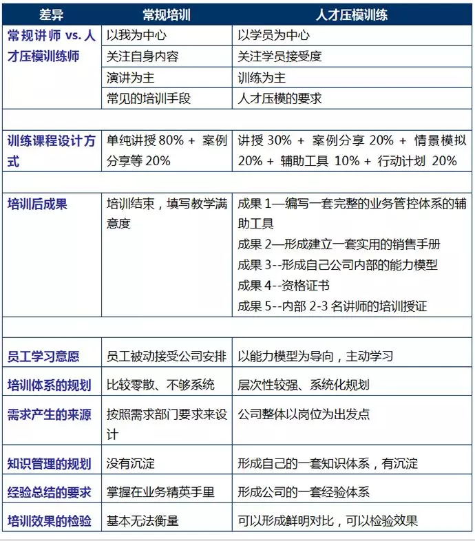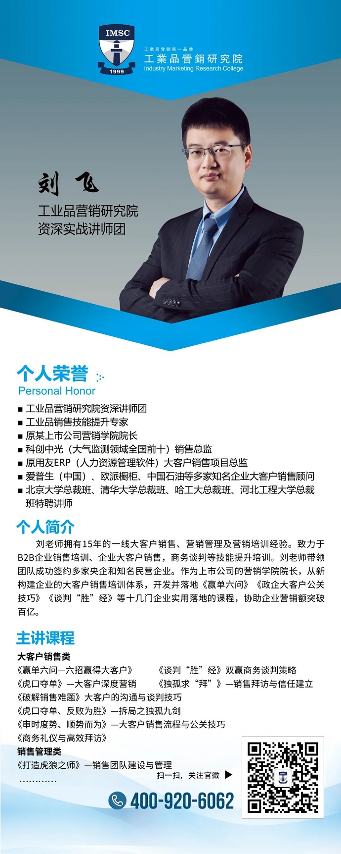 一、(1)工業(yè)品企業(yè)營(yíng)銷人才培養(yǎng)的8大困惑 1.新人的人數(shù)增長(zhǎng)非常快,沒有系統(tǒng)化的培訓(xùn),就直接投向市場(chǎng),導(dǎo)致無(wú)法勝任崗位的要求,得罪客戶,維護(hù)困難,影響銷售; 2.新人自己出不了單,導(dǎo)致積極性不高,激情不夠,培訓(xùn)不足,心態(tài)受到了很大的打擊,導(dǎo)致人才流失,成本較高; 3.老人基本上缺乏有效的管理經(jīng)驗(yàn),業(yè)務(wù)出身,銷售能力較強(qiáng),但是無(wú)法帶領(lǐng)新人,或帶領(lǐng)新人比較麻煩,與其讓培養(yǎng),不如自己干,無(wú)法勝任管理崗位的要求; 4.目前沒有一套成熟的經(jīng)驗(yàn)或者體系,來(lái)有效地復(fù)制或培養(yǎng)新人,導(dǎo)致經(jīng)驗(yàn)無(wú)法提煉,更沒有相應(yīng)的銷售手冊(cè),經(jīng)典案例來(lái)培養(yǎng)他人; 5.目前,公司的培訓(xùn)體系不夠完善,基本上靠外部培訓(xùn)為主,內(nèi)部無(wú)論是從經(jīng)驗(yàn)的角度、文化的傳承,費(fèi)用可以更節(jié)約一些,因此內(nèi)部成立培訓(xùn)師隊(duì)伍就非常重要; 6.銷售系統(tǒng)人事管理工作全部壓在直線經(jīng)理身上,人力資源管理缺位導(dǎo)致其功能不能充分發(fā)揮 ; 7.銷售系統(tǒng)缺乏人力規(guī)劃,人員需求和供給靠感覺,缺乏整體感造成不協(xié)調(diào),人員招聘的隨意性大; 8.公司的人員培訓(xùn)缺乏或培訓(xùn)體系不完善,缺乏培訓(xùn)的需求分析和培訓(xùn)總結(jié),培訓(xùn)的實(shí)施簡(jiǎn)單,員工發(fā)展后勁不足。 一、(2)工業(yè)品營(yíng)銷人才壓模培訓(xùn)系統(tǒng)的定義 針對(duì)目前中國(guó)工業(yè)品企業(yè)上述諸多問題和現(xiàn)狀,“工業(yè)品營(yíng)銷研究院”圍繞工業(yè)品營(yíng)銷人才必備的能力,特開設(shè)基于能力為導(dǎo)向的“工業(yè)品營(yíng)銷人才壓模訓(xùn)練系統(tǒng)”。是基于17年來(lái)工業(yè)品營(yíng)銷研究院300多家工業(yè)品企業(yè)的咨詢經(jīng)驗(yàn),3000多家工業(yè)企業(yè)營(yíng)銷培訓(xùn)的深厚經(jīng)驗(yàn),主要是為批量復(fù)制工業(yè)品營(yíng)銷人才,使工業(yè)企業(yè)營(yíng)銷團(tuán)隊(duì)新人能力提升更快,老銷售人員的能力培養(yǎng)更加系統(tǒng)化規(guī)范化,使公司的營(yíng)銷更加的切實(shí)有效,并且能夠書面化、流程化、體系化的一個(gè)訓(xùn)練系統(tǒng),讓營(yíng)銷知識(shí)技能得以傳承,并在訓(xùn)練后對(duì)其進(jìn)行評(píng)估、認(rèn)證,考核合格后正式上崗。 二、工業(yè)品營(yíng)銷人才訓(xùn)練模塊——專業(yè)性、針對(duì)性、系統(tǒng)性 ![]() 三、工業(yè)品營(yíng)銷人才壓模的訓(xùn)練方式 ![]() 四、(1)常規(guī)工業(yè)品營(yíng)銷業(yè)務(wù)管理現(xiàn)狀 第一階段:粗放式管理 優(yōu)點(diǎn):?jiǎn)伪鲬?zhàn),只關(guān)注結(jié)果,管理簡(jiǎn)單。 缺點(diǎn):難以控制過程,新人流失率極高,業(yè)績(jī)瓶頸。 第二階段:漏斗式管理 優(yōu)點(diǎn):對(duì)項(xiàng)目進(jìn)行階段劃分,強(qiáng)調(diào)團(tuán)隊(duì)配合和過程管控,管理效率顯著提升。 缺點(diǎn):缺乏策略、技巧、輔助工具,屬于半自動(dòng)化的管理工具。 第三階段:流程式管理 優(yōu)點(diǎn):對(duì)項(xiàng)目進(jìn)行階段劃分,強(qiáng)調(diào)團(tuán)隊(duì)配合和過程管控,強(qiáng)調(diào)階段性成果,并將管理制度、策略、技巧、輔助工具融為一體,管理效率大幅提升,屬于全自動(dòng)化的管理工具。 缺點(diǎn):對(duì)銷售管理人員的素質(zhì)提出了較高的要求,需要系統(tǒng)的培訓(xùn)。 四、(2)標(biāo)準(zhǔn)化工業(yè)品業(yè)務(wù)流程管控系統(tǒng) ![]() 五、課程大綱【課程主題1】 建立標(biāo)準(zhǔn)化的工業(yè)品業(yè)務(wù)流程體系 — 天龍八部 一、建立工業(yè)品業(yè)務(wù)流程體系-“天龍八部” 工業(yè)品營(yíng)銷的五大特征 粗放業(yè)務(wù)營(yíng)銷與精細(xì)業(yè)務(wù)管理 標(biāo)準(zhǔn)化業(yè)務(wù)開發(fā)的推進(jìn)流程(工程項(xiàng)目) 第一部:項(xiàng)目立項(xiàng)(10%) 第二部:深度接觸(20%) 第三部:方案設(shè)計(jì)(25%) 第四部:技術(shù)交流(30%) 第五部:方案確認(rèn)(50%) 第六部:項(xiàng)目評(píng)估(75%) 第七部:商務(wù)談判(90%) 第八部:合同執(zhí)行(100%) 工業(yè)品業(yè)務(wù)配套的推進(jìn)流程(工業(yè)配套) 第一部:客戶評(píng)估(10%) 第二部:方案設(shè)定(20%) 第三部:深度接觸(30%) 第四部:樣品實(shí)驗(yàn)(50%) 第五部:小批試用(60%) 第六部:簽訂合同(80%) 第七部:批量確認(rèn)(90%) 第八部:二次銷售(100%) “上量”的業(yè)務(wù)流程管控體系 客戶服務(wù)推進(jìn)流程體系 銷售里程碑與標(biāo)準(zhǔn)管理 銷售成交管理系統(tǒng) 項(xiàng)目性階段輔助工具 分析討論:我們推進(jìn)項(xiàng)目的每一個(gè)階段標(biāo)準(zhǔn)與條件是什么? 二、工業(yè)品業(yè)務(wù)的操作流程-“葵花寶典” 信息收集,捕風(fēng)造影“十八招” 發(fā)展線人,搞定小秘 引導(dǎo)需求,技術(shù)壁壘 利用線人,搞定高層 標(biāo)書制作,關(guān)系平衡 商務(wù)談判,合同風(fēng)險(xiǎn) 催款技巧, 項(xiàng)目推進(jìn) 案例分析:項(xiàng)目到了這一步,我該怎么辦? 三、工業(yè)品“天龍八部”銷售分析與管理 銷售人員如何來(lái)提升銷售階段? ---