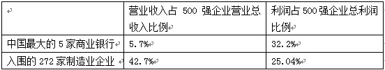 中國(guó)企業(yè)聯(lián)合會(huì)發(fā)布的《2012中國(guó)500強(qiáng)發(fā)展報(bào)告》顯示,制造業(yè)與商業(yè)銀行業(yè)之間的效益“鴻溝”在擴(kuò)大。