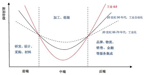 隨著新一次“工業(yè)革命”工業(yè)4.0的到來(lái),制造業(yè)微笑曲線的兩端將更為陡峭,中端的制造環(huán)節(jié)價(jià)值將進(jìn)一步被攤薄,特別是當(dāng)前我國(guó)勞動(dòng)力成本高漲后,制造業(yè)的利潤(rùn)進(jìn)一步被擠壓,向兩端索取增加值已經(jīng)迫在眉睫。