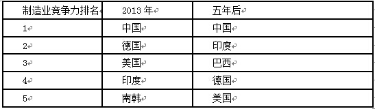 德勤有限公司全球制造業(yè)組與美國(guó)競(jìng)爭(zhēng)力委員會(huì)聯(lián)合發(fā)布的《2013全球制造業(yè)競(jìng)爭(zhēng)力指數(shù)》指出,如今全球制造業(yè)競(jìng)爭(zhēng)格局發(fā)生了翻天覆地的變化,中國(guó)的制造業(yè)競(jìng)爭(zhēng)力指數(shù)高于美國(guó)、德國(guó),在當(dāng)前以及未來(lái)五年均位居榜首。