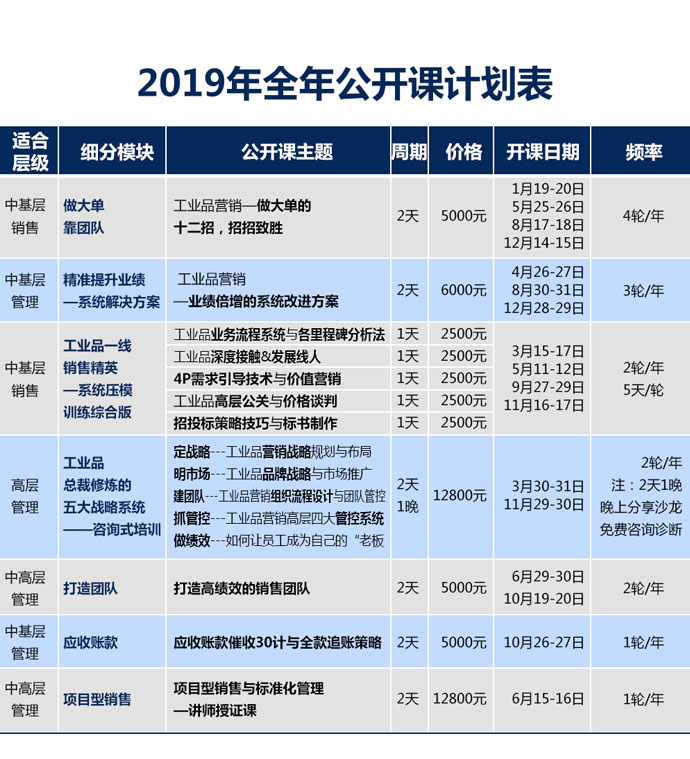 本課程從工業(yè)品銷售自身獨特點出發(fā),解析工業(yè)品營銷的5大特性和8大困惑,明確業(yè)務(wù)流程過程中應(yīng)有的14個不同層次的排列邏輯,通過講解核心知識點及工具方法,結(jié)合案例及模擬演練,幫助銷售人員了解各個關(guān)鍵節(jié)點的內(nèi)容及含義、清晰劃分項目所處階段,并擁有利用精細(xì)化管理思路來梳理業(yè)務(wù)流程的能力。在營銷及服務(wù)管理中,針對每個節(jié)點進(jìn)行有效質(zhì)量控制,通過每個過程細(xì)節(jié)進(jìn)行精細(xì)化管理,從而達(dá)到全面營銷質(zhì)量管理。