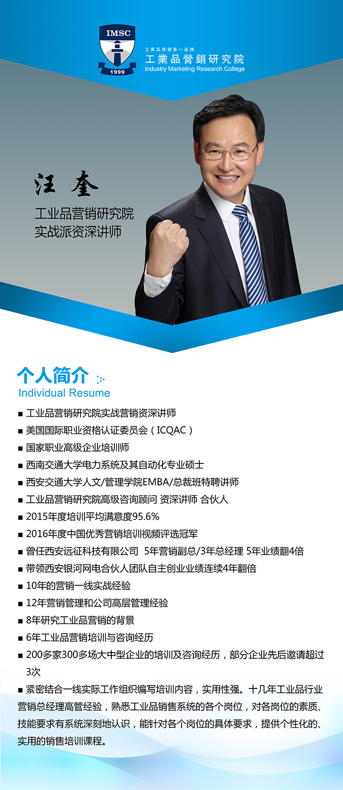 針對(duì)目前中國(guó)工業(yè)品企業(yè)上述諸多問(wèn)題和現(xiàn)狀,“工業(yè)品營(yíng)銷研究院”圍繞工業(yè)品營(yíng)銷人才必備的能力,特開(kāi)設(shè)基于能力為導(dǎo)向的“工業(yè)品營(yíng)銷人才壓模訓(xùn)練系統(tǒng)”。是基于18年來(lái)工業(yè)品營(yíng)銷研究院300多家工業(yè)品企業(yè)的咨詢經(jīng)驗(yàn),3000多家工業(yè)企業(yè)營(yíng)銷培訓(xùn)的深厚經(jīng)驗(yàn),主要是為批量復(fù)制工業(yè)品營(yíng)銷人才,使工業(yè)企業(yè)營(yíng)銷團(tuán)隊(duì)新人能力提升更快,老銷售人員的能力培養(yǎng)更加系統(tǒng)化規(guī)范化,使公司的營(yíng)銷更加的切實(shí)有效,并且能夠書(shū)面化、流程化、體系化的一個(gè)訓(xùn)練系統(tǒng),讓營(yíng)銷知識(shí)技能得以傳承,并在訓(xùn)練后對(duì)其進(jìn)行評(píng)估、認(rèn)證,考核合格后正式上崗。