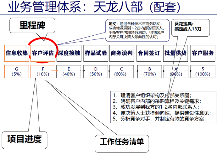 天龍八部是針對工業(yè)品營銷的周期長、過程復雜、涉及的人員眾多等特點,專門開發(fā)的一套精細化管理的工具。天龍八部就是一個精細化的過程管控思路,注重了過程,才有結(jié)果,這個對工業(yè)品營銷非常重要。