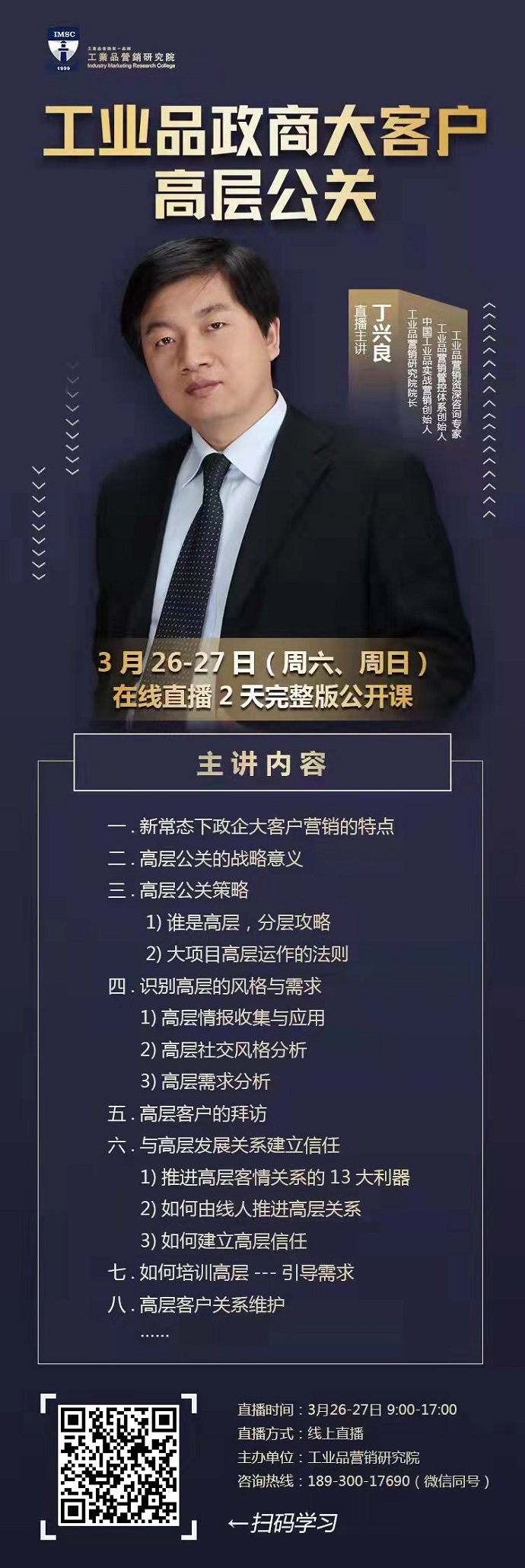 工業(yè)品營(yíng)銷研究院2003年專注于工業(yè)品營(yíng)銷研究領(lǐng)域,創(chuàng)始人丁興良院長(zhǎng)攜手?jǐn)?shù)位工業(yè)品營(yíng)銷專家發(fā)起,是中國第一家專注于工業(yè)品營(yíng)銷咨詢與培訓(xùn)的專業(yè)智力機(jī)構(gòu),在國內(nèi)第一家提出工業(yè)品營(yíng)銷概念的咨詢機(jī)構(gòu),擁有最懂工業(yè)品營(yíng)銷咨詢和培訓(xùn)的頂尖實(shí)戰(zhàn)派專家實(shí)力團(tuán)隊(duì),熟知工業(yè)品企業(yè)特質(zhì),深諳工業(yè)品營(yíng)銷模式。工業(yè)品營(yíng)銷咨詢、工業(yè)品營(yíng)銷培訓(xùn)、工業(yè)品營(yíng)銷線上學(xué)習(xí)平臺(tái)、研發(fā)工業(yè)品業(yè)務(wù)流程管控PSM軟件、編寫工業(yè)品營(yíng)銷手冊(cè),出版工業(yè)品營(yíng)銷專業(yè)書籍80本等,360度全方位輔導(dǎo)廣大工業(yè)品企業(yè),成為中國工業(yè)品營(yíng)銷咨詢與培訓(xùn)的領(lǐng)航者!