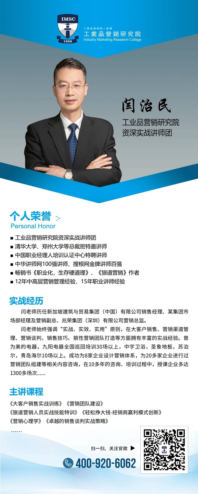 20%的客戶創(chuàng)造80%的利潤,如何把控及經(jīng)營好這20%的大客戶,利用3500個工業(yè)品大額產(chǎn)品的銷售案例研究出的銷售智慧,培訓過全國60%大中型知名工業(yè)企業(yè),獲得一致好評的經(jīng)典課程體系!
