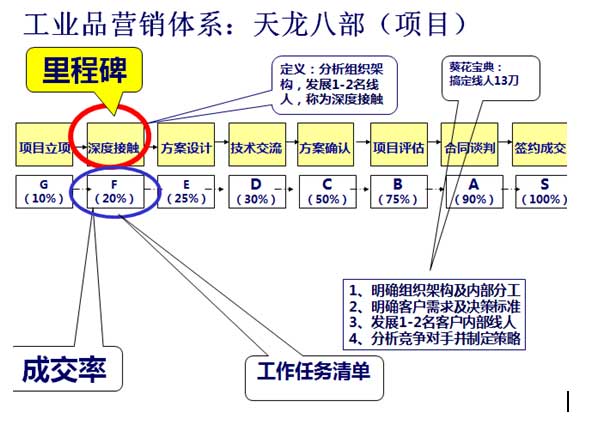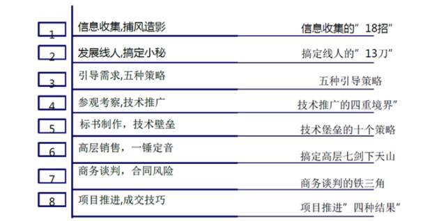 工業(yè)品營(yíng)銷業(yè)務(wù)管控體系分為信息收集,項(xiàng)目立項(xiàng),深度接觸,技術(shù)交流,方案確認(rèn),商務(wù)公關(guān),