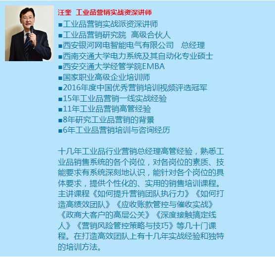 【授課講師】工業(yè)品營銷研究院院長(zhǎng) 丁興良 領(lǐng)銜專家講師團(tuán) 【溫馨提示】:可以報(bào)名單次公開課或者分層級(jí)系統(tǒng)管理,詳情請(qǐng)來電咨詢400-920-6062.