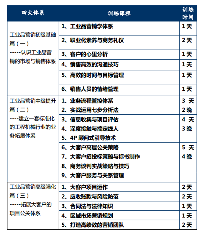 【課程背景】 提升營(yíng)銷人員的綜合銷售能力,提升營(yíng)銷人員的職業(yè)化素養(yǎng),認(rèn)識(shí)工業(yè)品營(yíng)銷的市場(chǎng)與銷售體系。 本次培訓(xùn)為期7天,所有課程均由具備豐富實(shí)戰(zhàn)經(jīng)驗(yàn)的講師負(fù)責(zé)授課,專為本屆營(yíng)銷精英們量身打造,課程具備針對(duì)性、系統(tǒng)性、專業(yè)性、規(guī)范性等特點(diǎn)。 ![]()