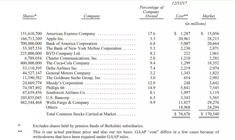 下面是截至年末我們投資的市值最高的15只普通股。這里不計我們在卡夫亨氏中的持股—— 325,442,152股——因為伯克希爾是控股方的一員,必須用“權(quán)益法”來衡量該投資。