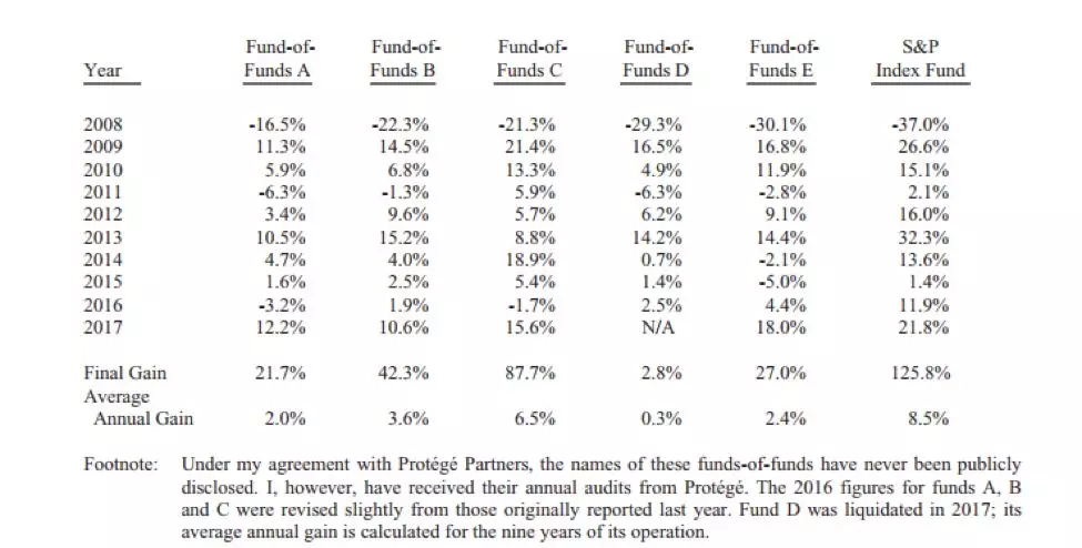 作為我的投資對賭對手,Protégé Partners選擇了五只“基金中的基金”,并預(yù)計它將超過標準普爾500指數(shù)。這不是特例。這五只基金中的基金涵蓋了超過200個對沖基金。
