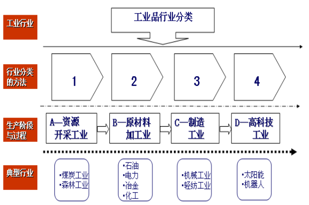 工業(yè)品行業(yè)的分類(lèi)應(yīng)依據(jù)從資源開(kāi)采到原材料加工,再到最終產(chǎn)品制造,最后到高科技發(fā)展這個(gè)生產(chǎn)階段和過(guò)程為基本框架。