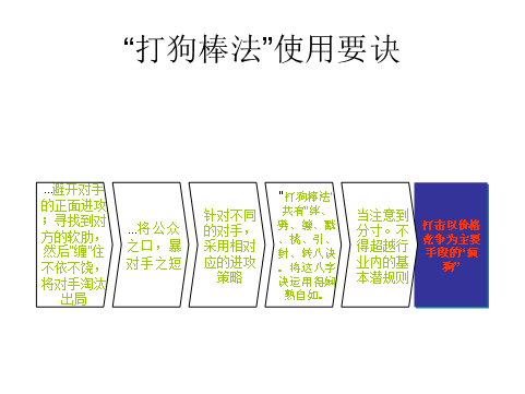 五 “打狗棒法”在實(shí)際運(yùn)作中,當(dāng)注意到分寸。不得超越行業(yè)內(nèi)的基本潛規(guī)則。以避免引起公憤。2007年的“原水門”事件中,新聞媒體曝光K牌的所謂優(yōu)質(zhì)水來自于普通自來水。讓K牌瓶裝水的銷售量大受影響。其中的幕后主使就是競(jìng)爭對(duì)手N飲用水公司。2009年的“砒霜門”事件同樣讓N公司深受其害。而這次幕后主使換成了K公司。俗話說:“出來混,欠的債總是要還的”。企業(yè)在使用“打狗棒法”時(shí),當(dāng)注意不要樹敵過多,面對(duì)對(duì)手“以彼之道,還彼之身”。