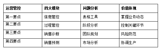 運(yùn)營(yíng)管控主要是指在營(yíng)銷(xiāo)過(guò)程當(dāng)中對(duì)銷(xiāo)售信息的管控、項(xiàng)目的管控及費(fèi)用的管控等,從而實(shí)現(xiàn)一切盡在掌控之中。運(yùn)營(yíng)管控的實(shí)質(zhì),是資源的管控, 即對(duì)企業(yè)擁有的資源進(jìn)行充分的有效調(diào)解。運(yùn)營(yíng)管控表如表2-3所示。